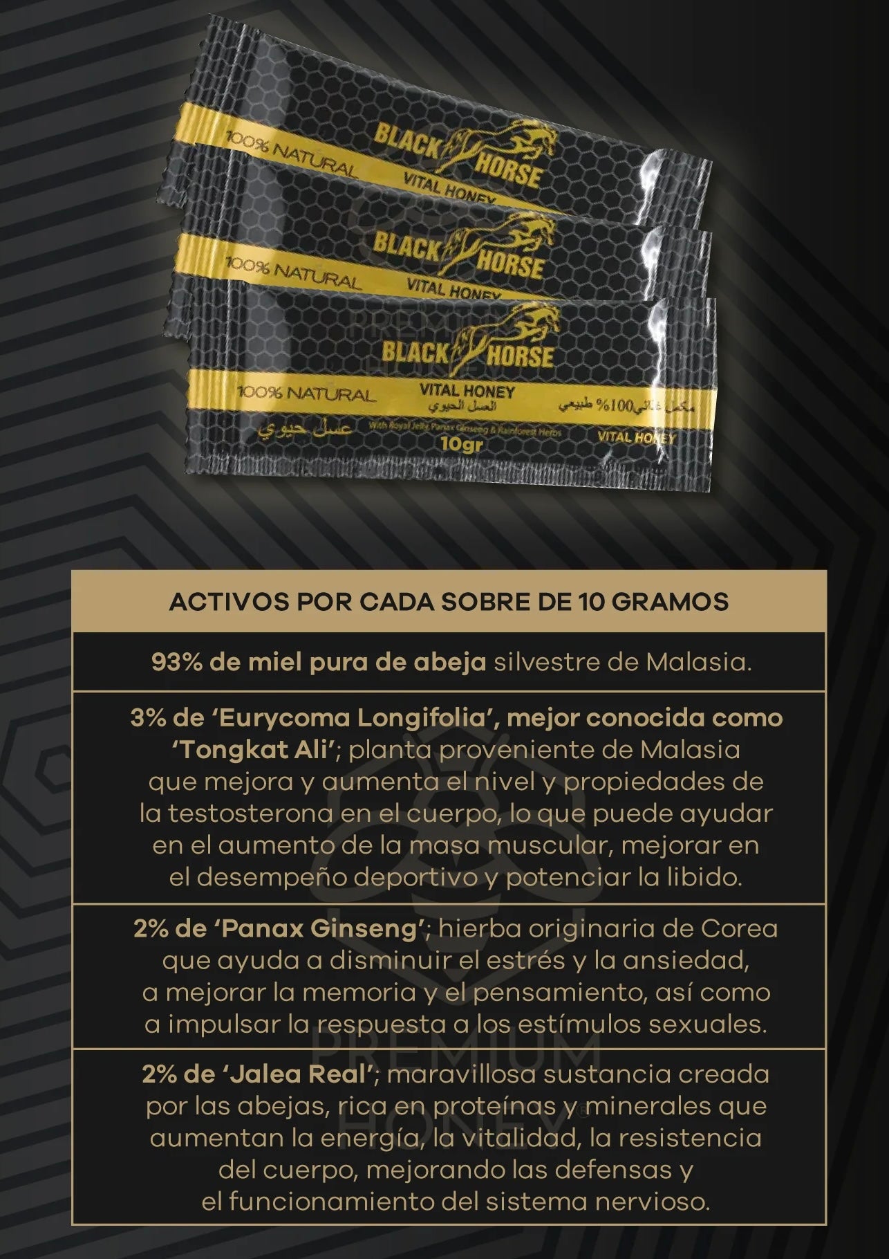 Black Horse es un suplemento en miel formulado con extractos naturales cuidadosamente seleccionados, diseñado para apoyar la energía, la resistencia y el rendimiento masculino. Su fórmula contribuye a mejorar la vitalidad y la confianza, favoreciendo una experiencia íntima más intensa y prolongada.